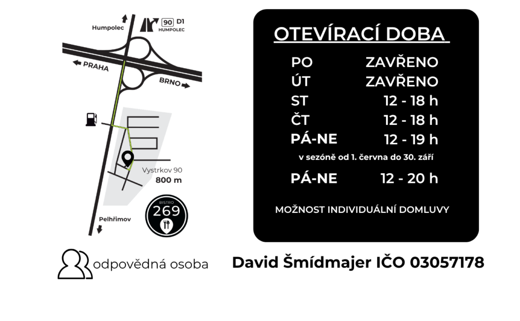 KONTAKT NABÍDKA DOMŮ O NÁS AZYLY info@bistro269.cz +420605411965 SLEDUJTE NAŠE SOCIÁLNÍ SÍTĚ INSTAGRAM FACEBOOK POZOR DOČASNÁ ZMĚNA OTEVÍRACÍ DOBYSTŘEDA - NEDĚLE 12-18H JINAK PO DOMLUVĚ